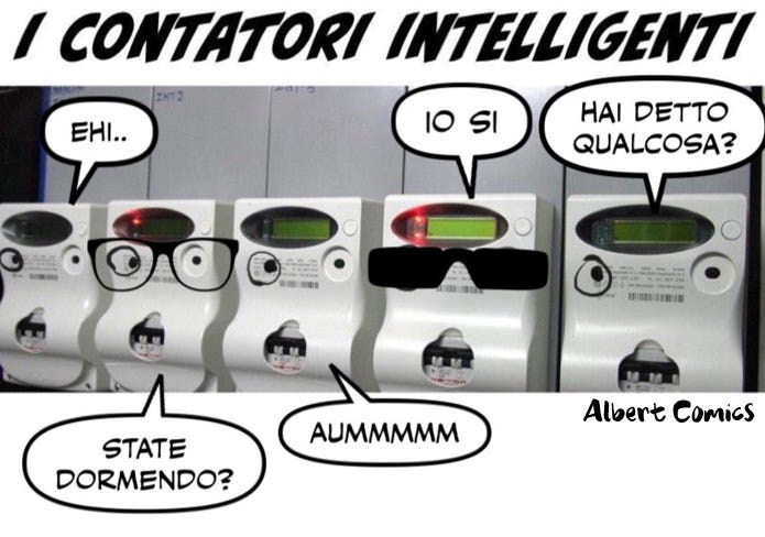 “Signore, questo contatore è dotato di Intelligenza Artificiale di ultima generazione. Qui non si tratta più di centellinarvi l’energia elettrica, qui è proprio lui che vi dirà cosa mangiare, quando lavarvi i capelli o quando tirare lo sciacquone.”
